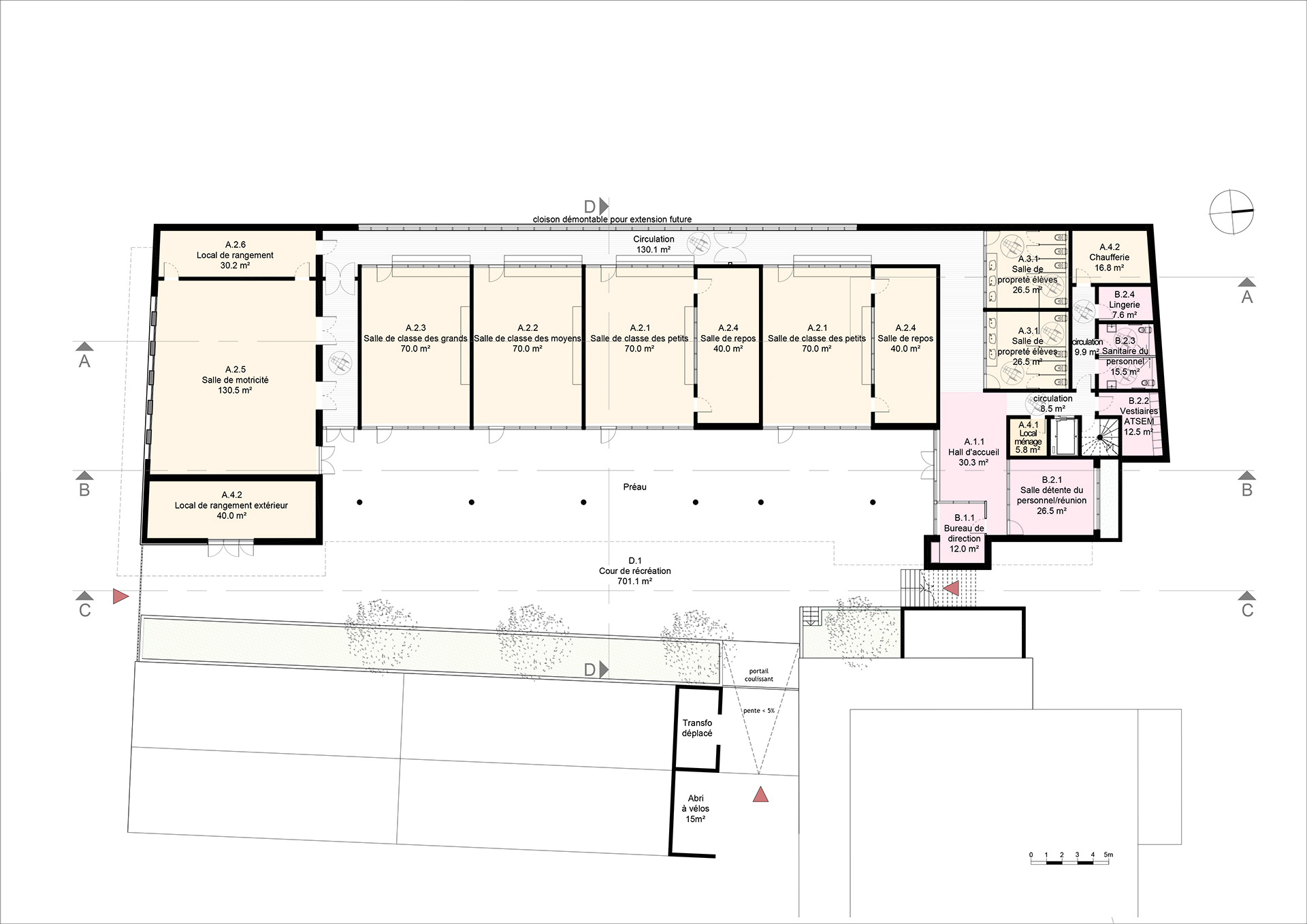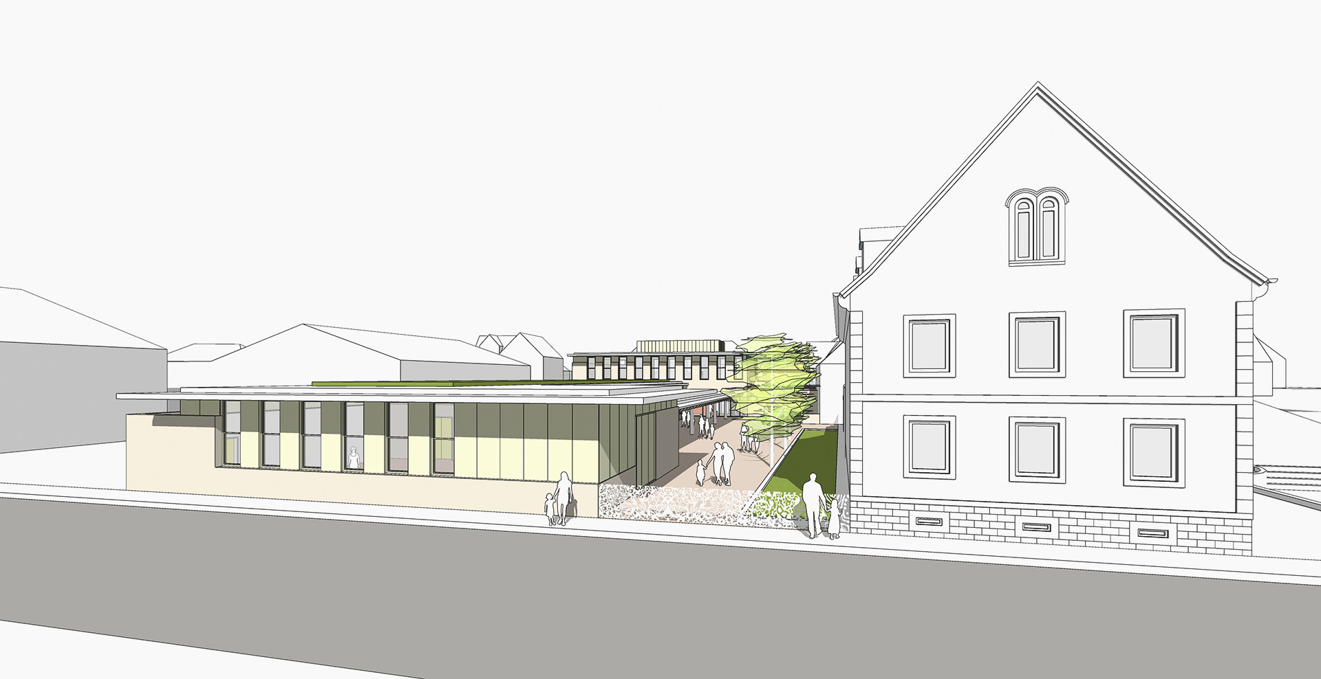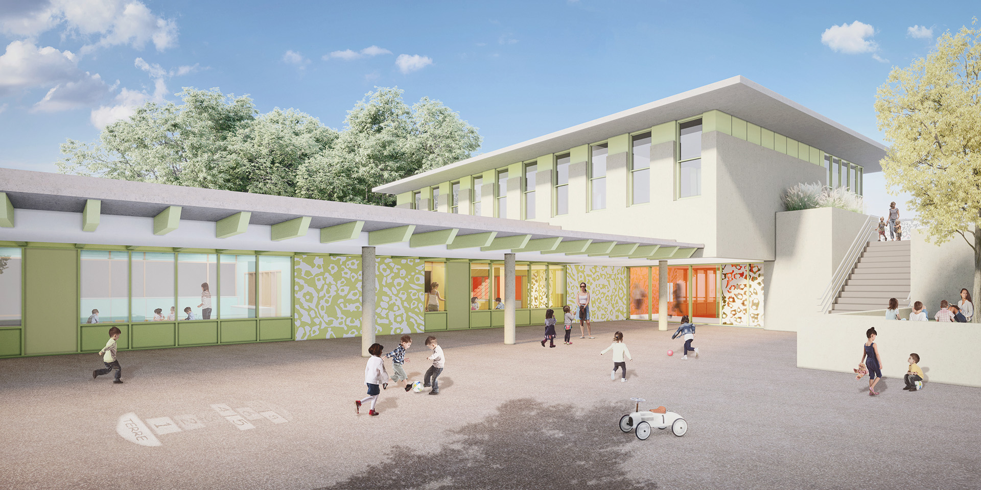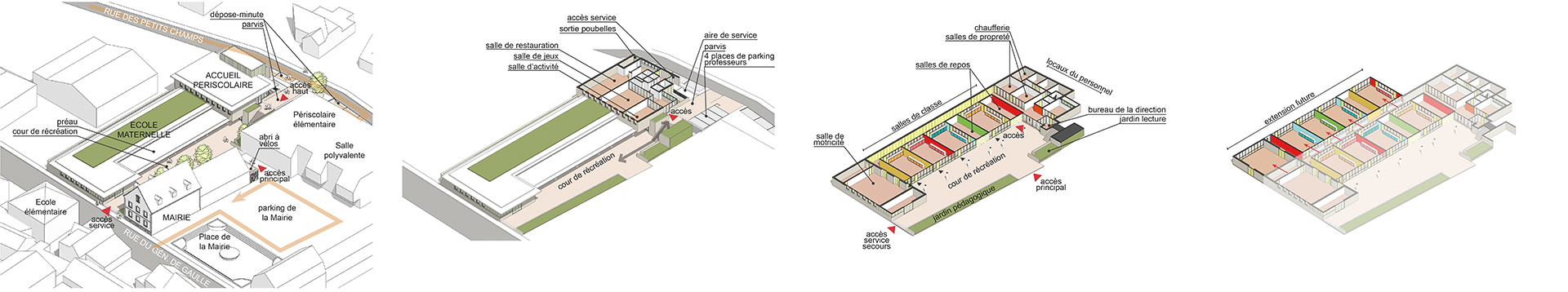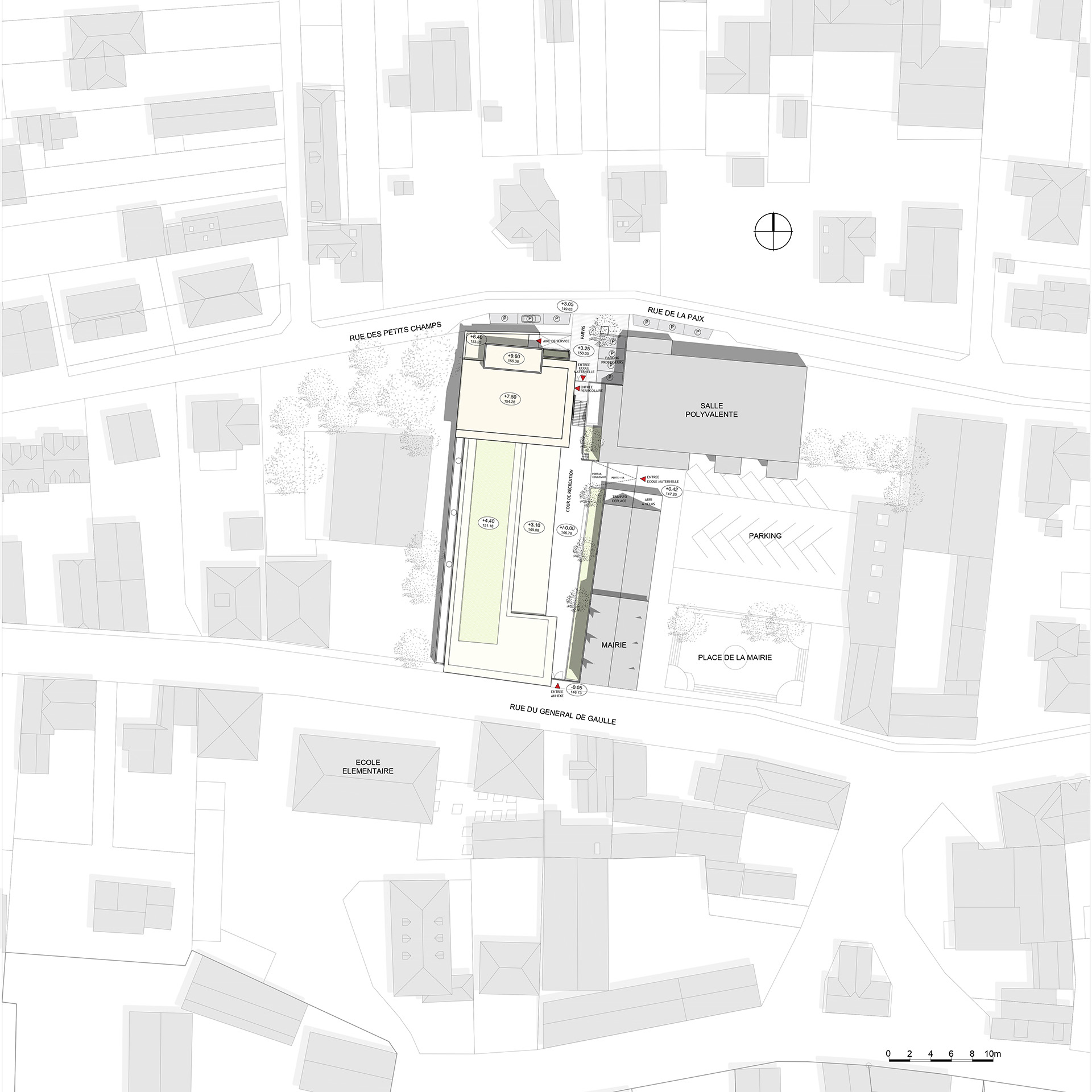La nouvelle construction organisée autour de la Cour de récréation s’inscrit dans un ensemble bâti construit autour de la Mairie et de sa Place. L’Ecole exprime un volume de facture contemporaine, sobre et discret dans le choix des teintes, en harmonie avec les bâtiments publics voisins, alliant des parties maçonnées et des façades légères protégées par des débords de toits généreux. La façade sur rue du Général De Gaulle est traitée en dialogue avec la façade de la Mairie, avec l’expression d’un soubassement et un jeu de matériaux et de teintes en harmonie avec le bâti existant.