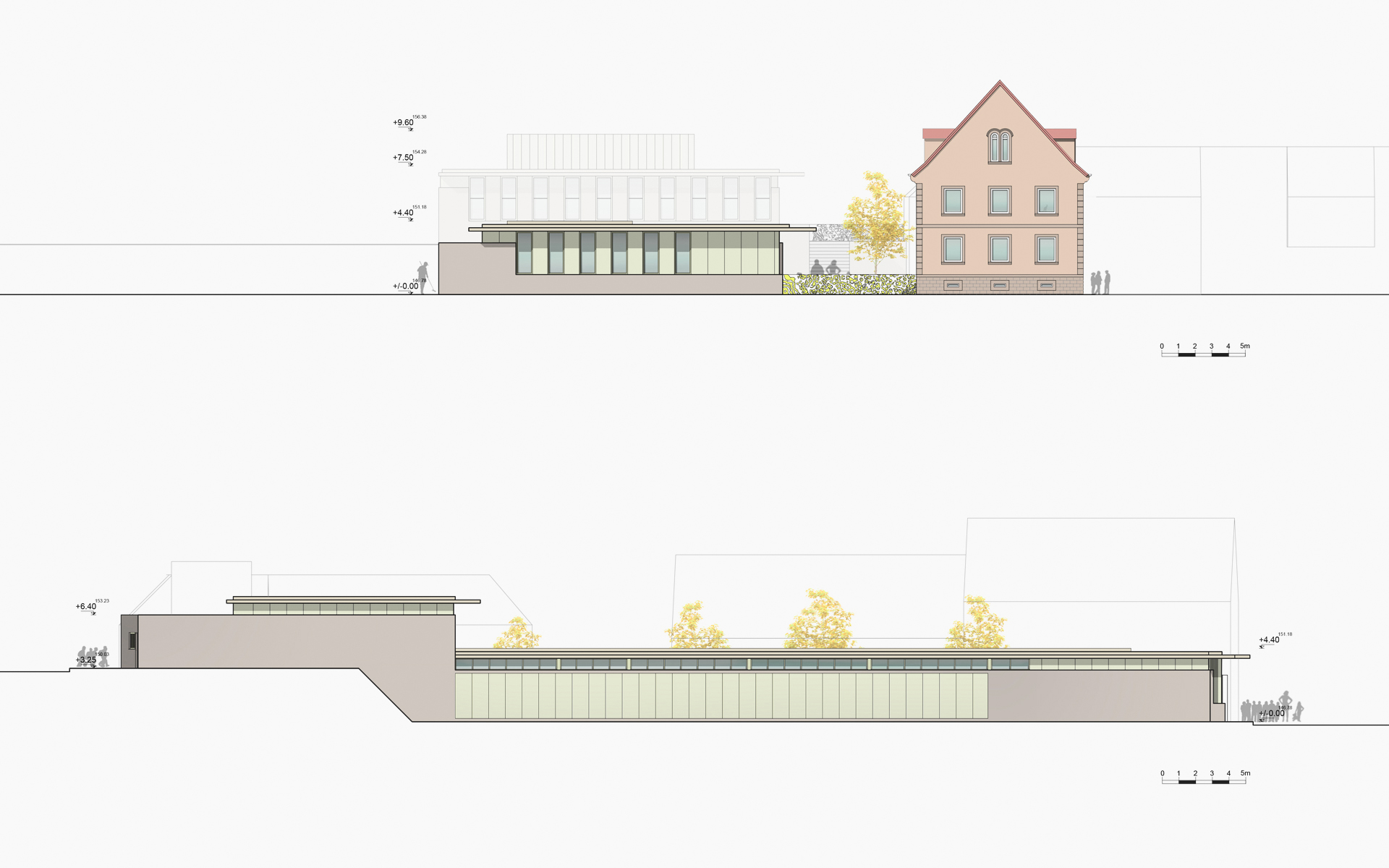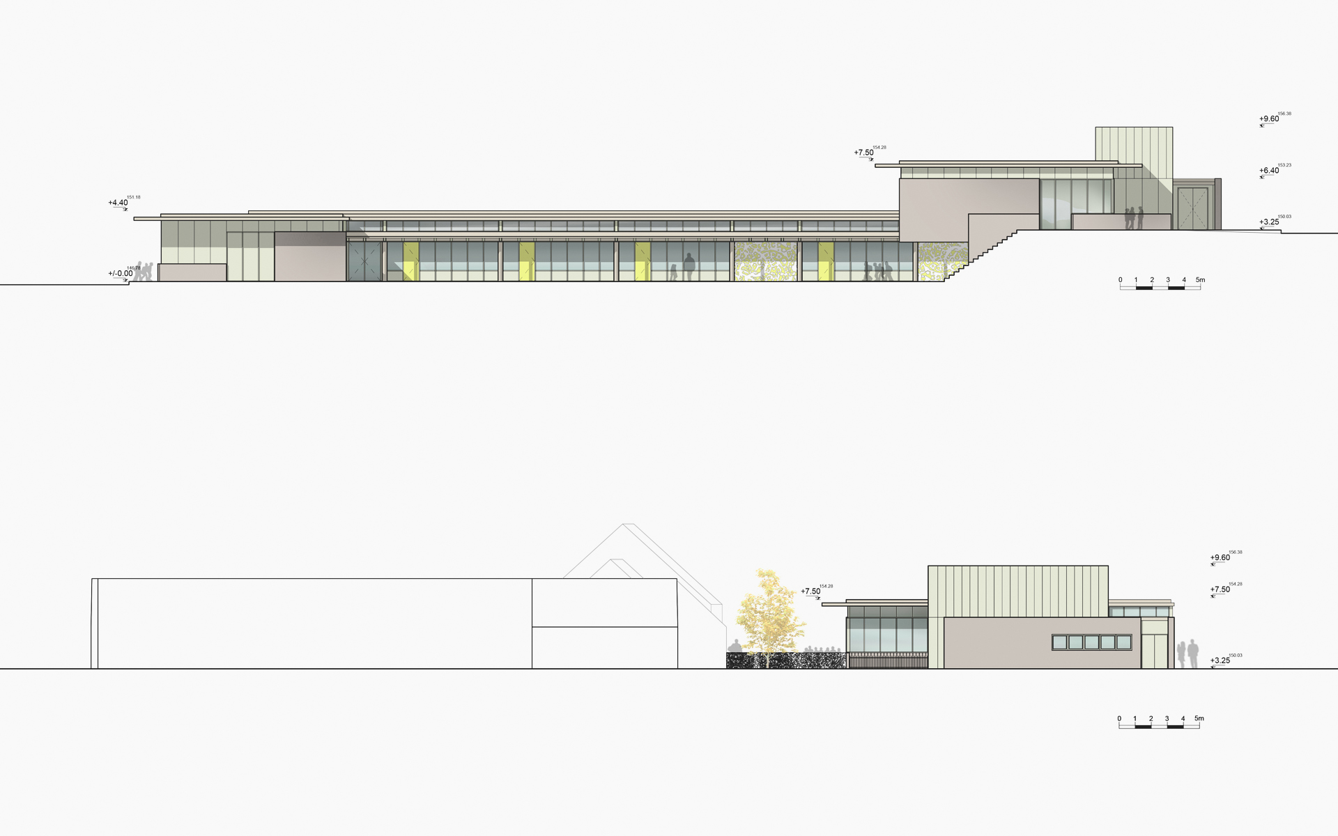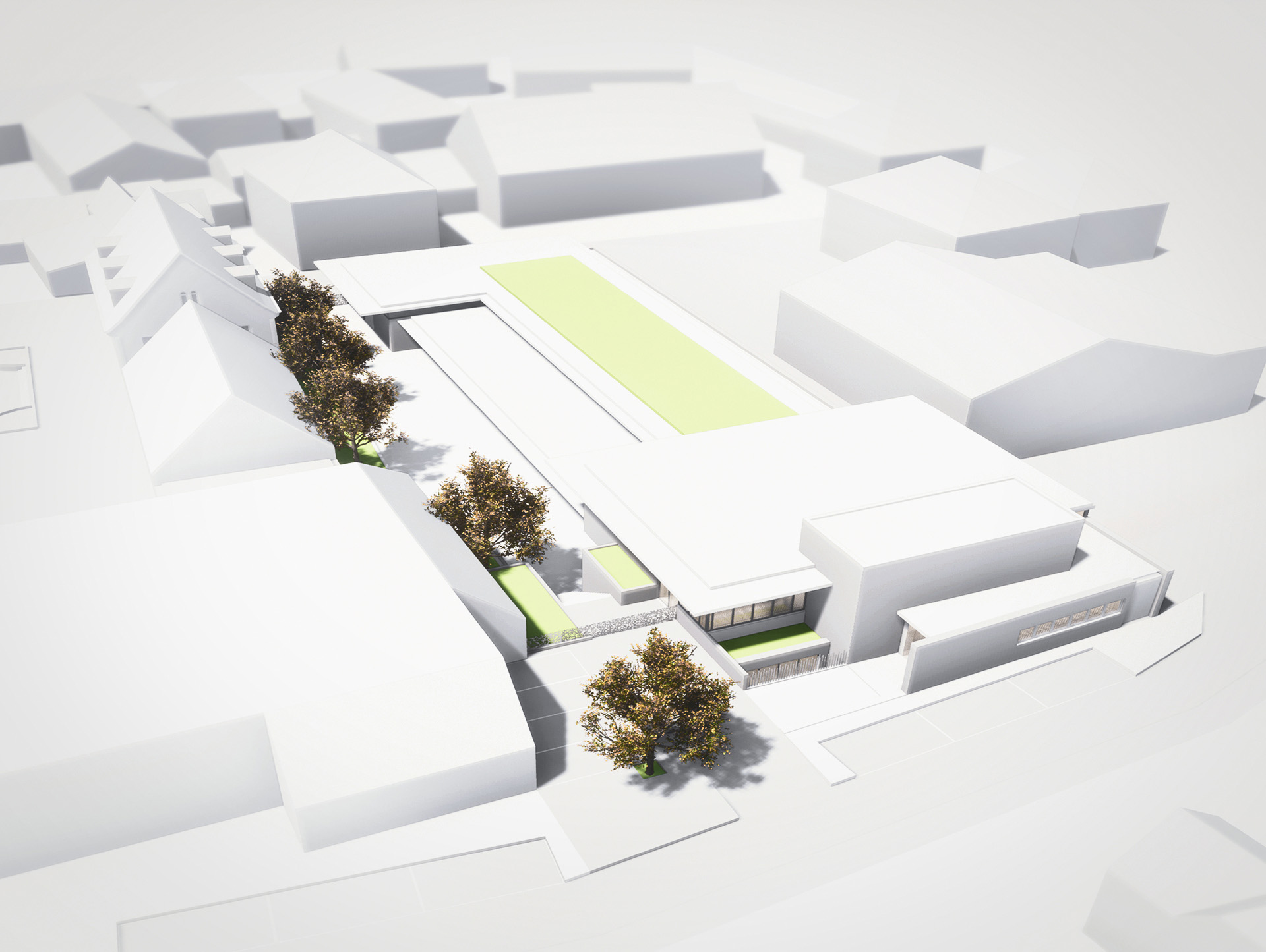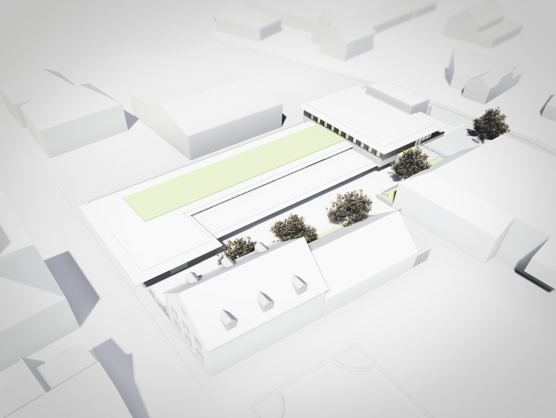 L’architecture proposée répond aux nécessaires compacité et fonctionnalité du projet, par l’intermédiaire de formes simples et identifiables, d’un jeu de transparences, d’opacités et de contrastes de matériaux, jouant sur la multiplicité des vues et des lumières naturelles, et composant la géométrie des espaces extérieurs. Ce registre formel permet d’identifier les différents éléments du projet tout en les rassemblant dans une même cohérence, ce qui confère à cette nouvelle construction une identité et des proportions en rapport avec l’échelle des constructions environnantes.