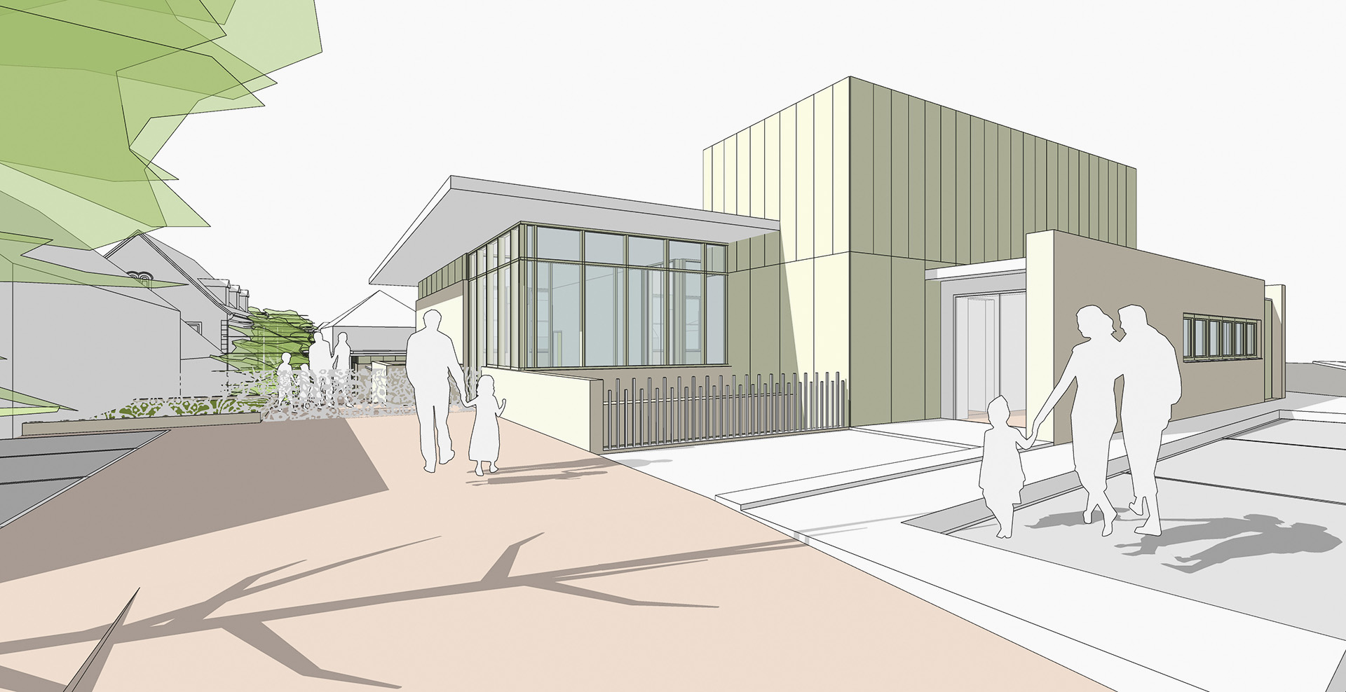 Les entrées à la Cour sont identifiées par des portails et grilles de serrurerie traités en fer plat et en tôle découpée. Le volume de l’Accueil Périscolaire, positionné en limite haute du terrain, peut se lire comme un bâtiment indépendant, à l’échelle du bâti peu dense de type maison et jardins caractérisant la rue des Petits Champs.