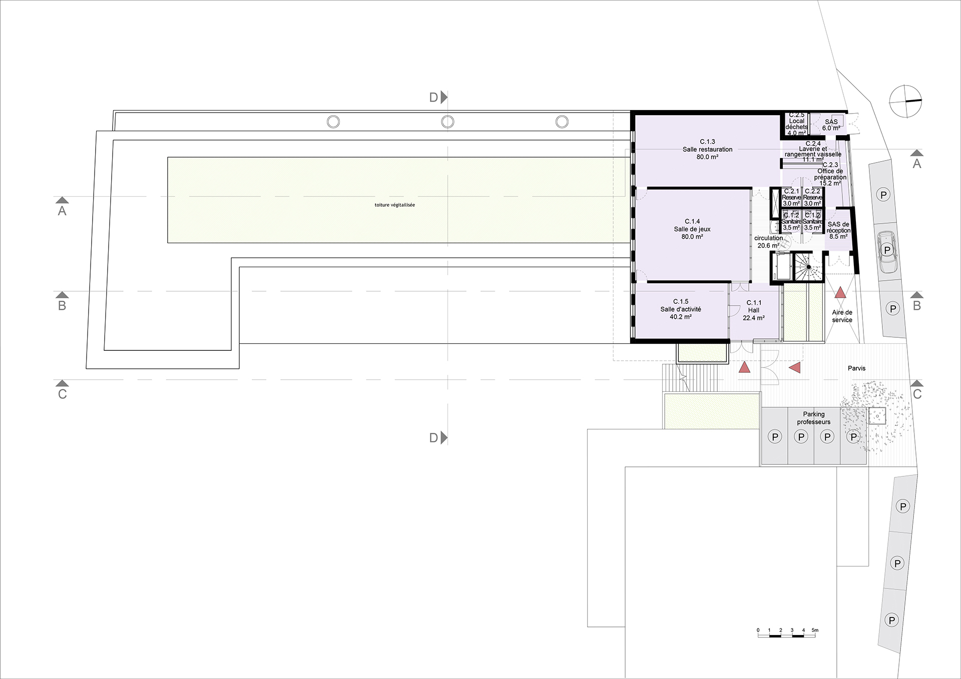 Un travail approfondi a été mené sur le choix des matériaux, le traitement des enveloppes extérieures et des dispositifs architecturaux et techniques, qui favorisent le traitement naturel de la ventilation et de la protection ou de la régulation des apports solaires, par des dispositifs simples, pérennes et sans apport technologique lourd et consommateur d’énergie. Ce travail se traduit par un dialogue entre matériaux, choisis pour leur résistance et leur pérennité : Les espaces réservés à l’accueil et aux activités des enfants sont construits, en structure mixte béton et ossature bois, avec isolation naturelle intérieure et dans l’épaisseur des parois. Les façades largement vitrées laissent apparaître les ossatures bois associées à des menuiseries alu de type mur rideau. Les vêtures sont constituées de panneaux fibre-ciment de teinte vert cuivre. Des stores et brise-soleils extérieurs motorisés sont disposés entre les montants des ouvertures des façades Sud. L’expression du matériau bois au moyen d’habillages muraux et de mobilier est privilégiée en aménagement intérieur et en sous-face du préau. Les toitures sont traitées en toiture terrasse avec membrane d’étanchéité partiellement végétalisée et présentent de larges débords.